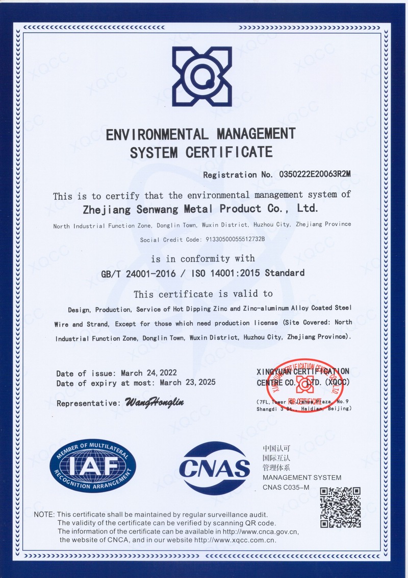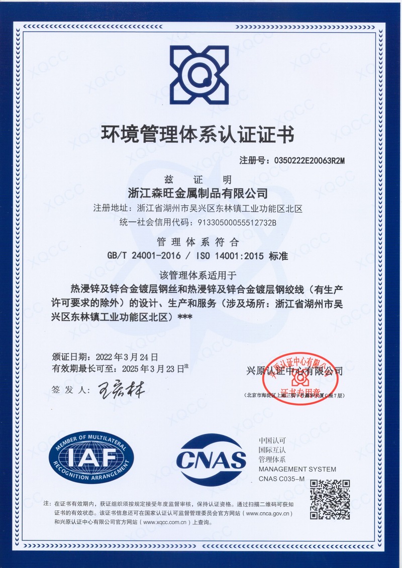 浙江森旺金屬制品有限公司成立于2012年,坐落湖州市吳興區(qū)東林鎮(zhèn)工業(yè)功能區(qū)。公司專業(yè)從事各類鍍鋅鋼絲、鋼絞線等產(chǎn)品的開發(fā)及生產(chǎn)。目前產(chǎn)品已廣泛應(yīng)用于各類通信光電纜,電力輸送,電氣化鐵路工程,各類堤壩防護(hù)及農(nóng)業(yè)溫室等工程領(lǐng)域。公司秉承“追求卓越品質(zhì),創(chuàng)建卓著信譽(yù)”的經(jīng)營(yíng)理念,始終堅(jiān)持專業(yè)化、規(guī)模化的經(jīng)營(yíng)模式。
